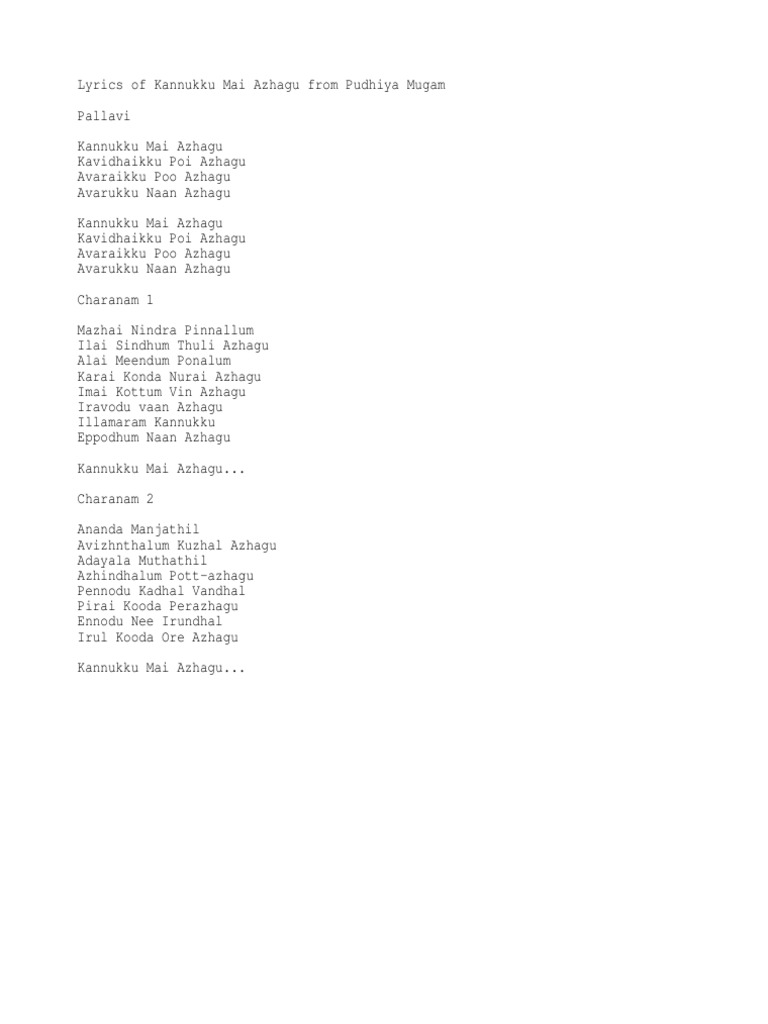 Kannukku Mai Azhagu Lyrics Tamil : Kannukku mai azhagu kavidaikku poi azhagu, avaraikku poo azhagu avarukku nan azhagu, anantha manjathil, avizhnthalum kuzhal azhagu, adaiyala muthathil, azhinthalum pottu azhagu, pennoadu kadal vandal pirai kooda perazhagu, ennodu nee irunthal, irul kooda oar azhagu