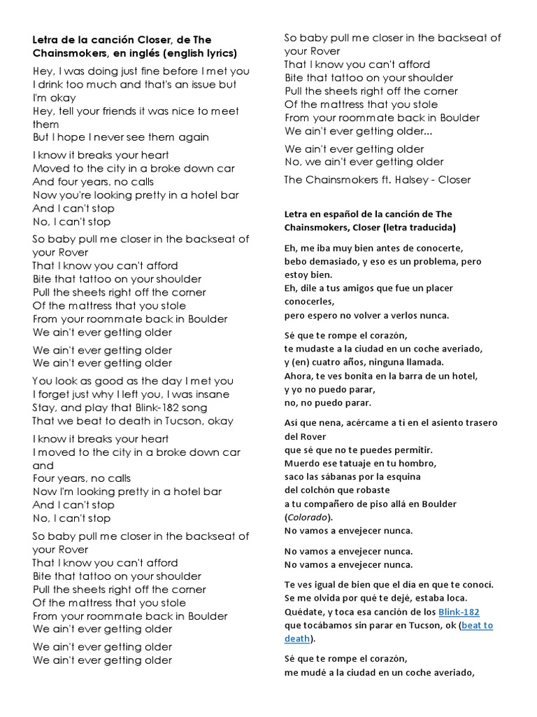 Genius Traducciones Al Espanol The Chainsmokers Illenium Takeaway Ft Lennon Stella Traduccion Al Espanol Lyrics Genius Lyrics Halsey)', 'don't let me down', 'something just like this (with coldplay)', 'who do you love (feat.