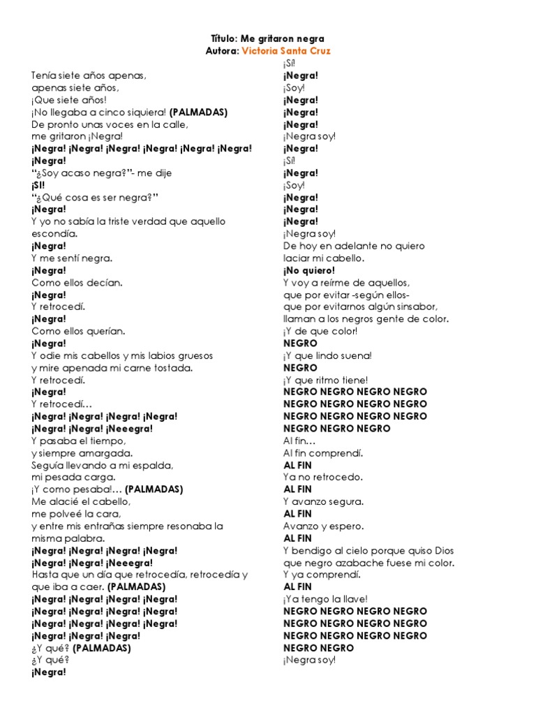 Victoria Santa Cruz Me Gritaron Negra Letra : Fue compositora, investigadora del folclore afroperuano y coreógrafa.